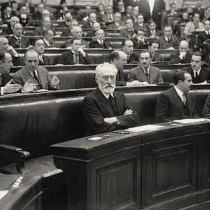 Miguel de Unamuno en el Congreso, cariacontecido (CMU)